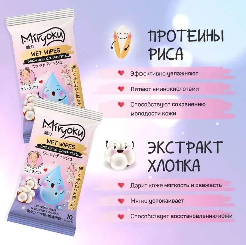 - Для ежедневного ухода: Влажные салфетки MIRYOKU – это идеальное решение для поддержания чистоты и свежести кожи в течение дня.